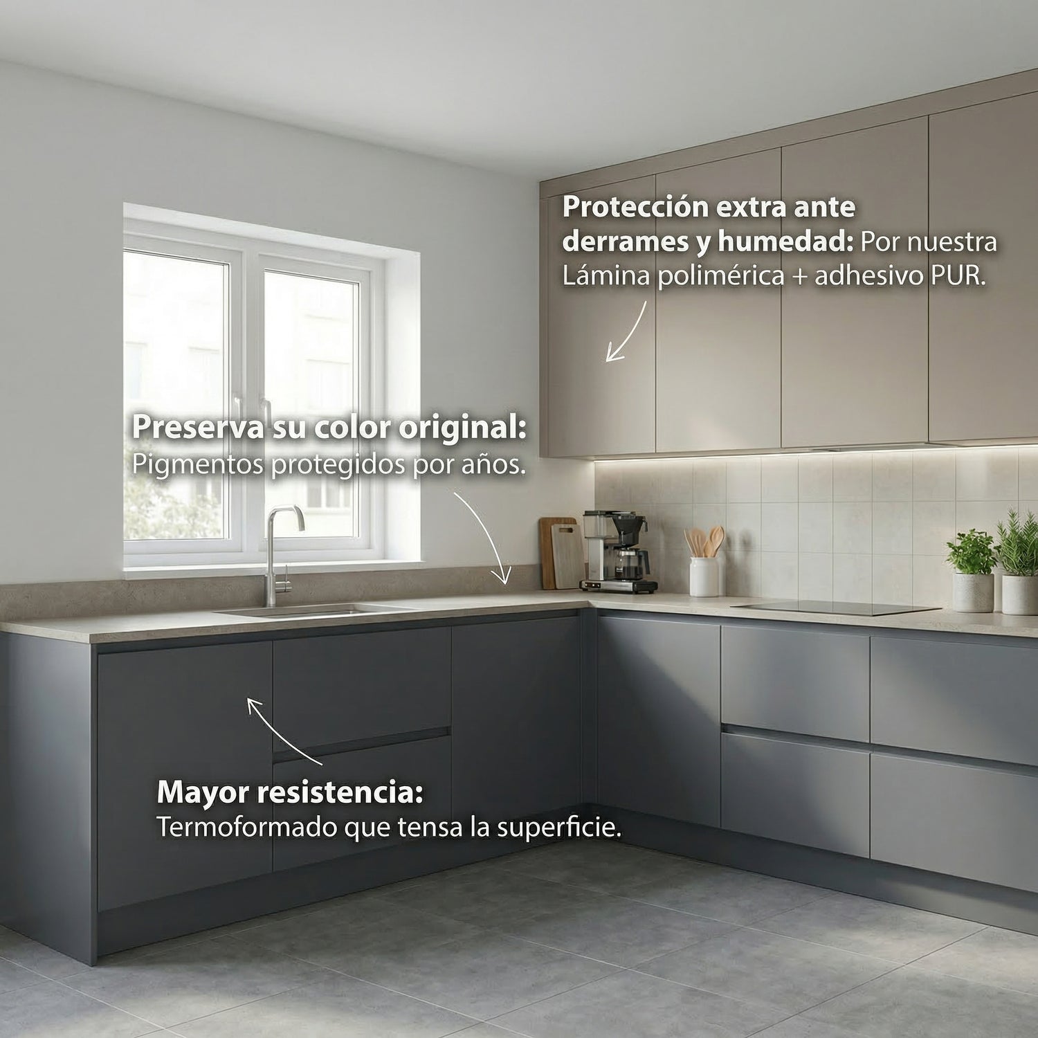 No, en Refront fabricamos frentes a medida: puertas, tapas de cajones y frentes de alacenas. Es lo que realmente se ve en tu cocina. Renovás sin obras, sin desmontar nada.